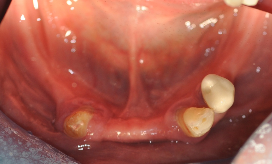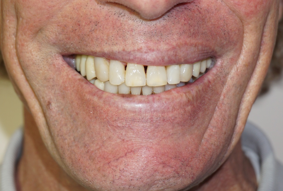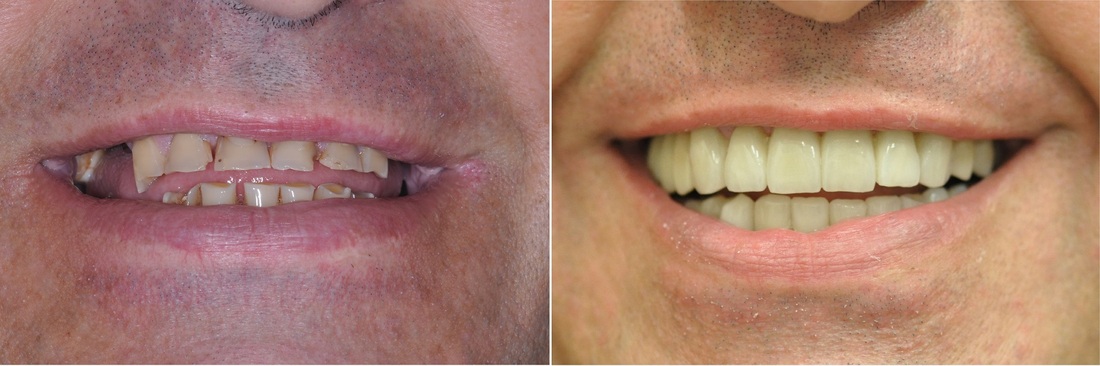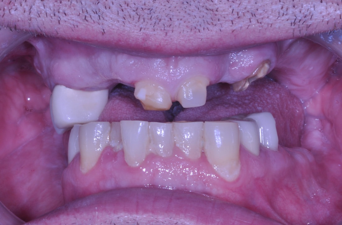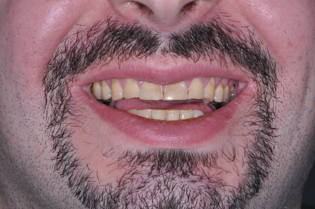 This patient presented with the poor prognosis for his upper teeth, severe bone loss and bite problems.