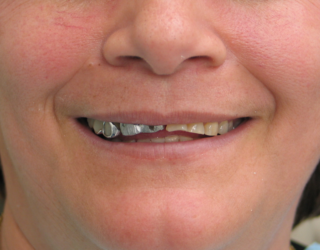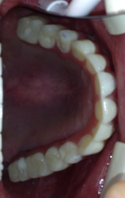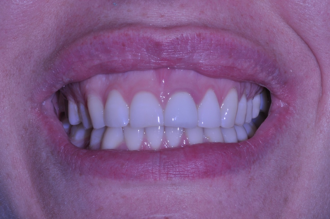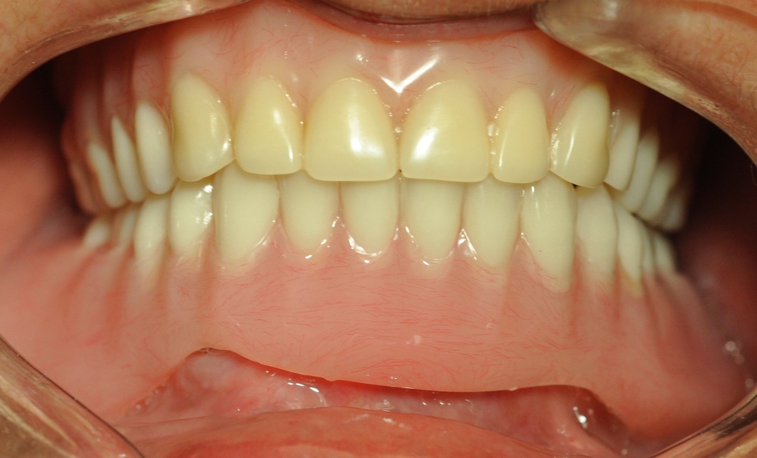 Collapsed bite had been opened with Gneuromuscular technique. Occlusion was equilibrated 2 weeks after delivery with TENS. Cavities on front teeth were filled with tooth-colored composite fillings.