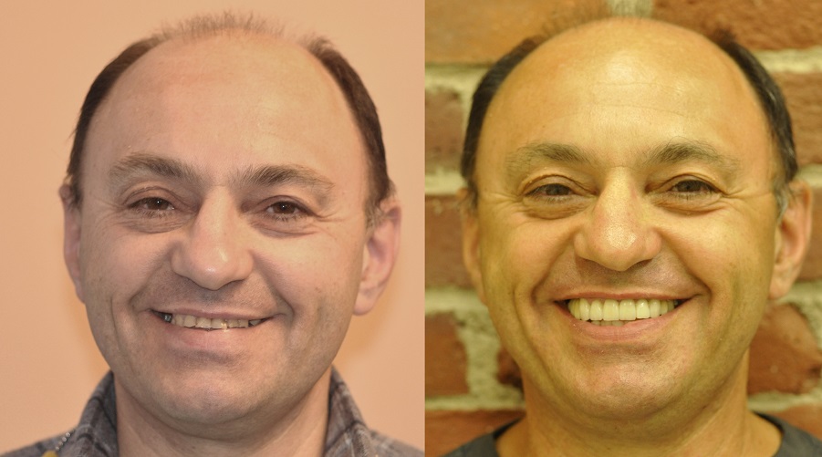 After thorough evaluation Dr. Andrews recommended ALL-ON-6 fixed implant bridge. The entire surgical stage, including extractions of all remaining upper teeth, bi-lateral sinus lift (right and left side), multiple bone grafts and placement of all 6 dental implants was accomplished by Dr. Andrews in one visit. Six months later the full upper arch dental implant bridge was delivered.