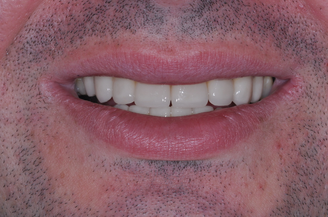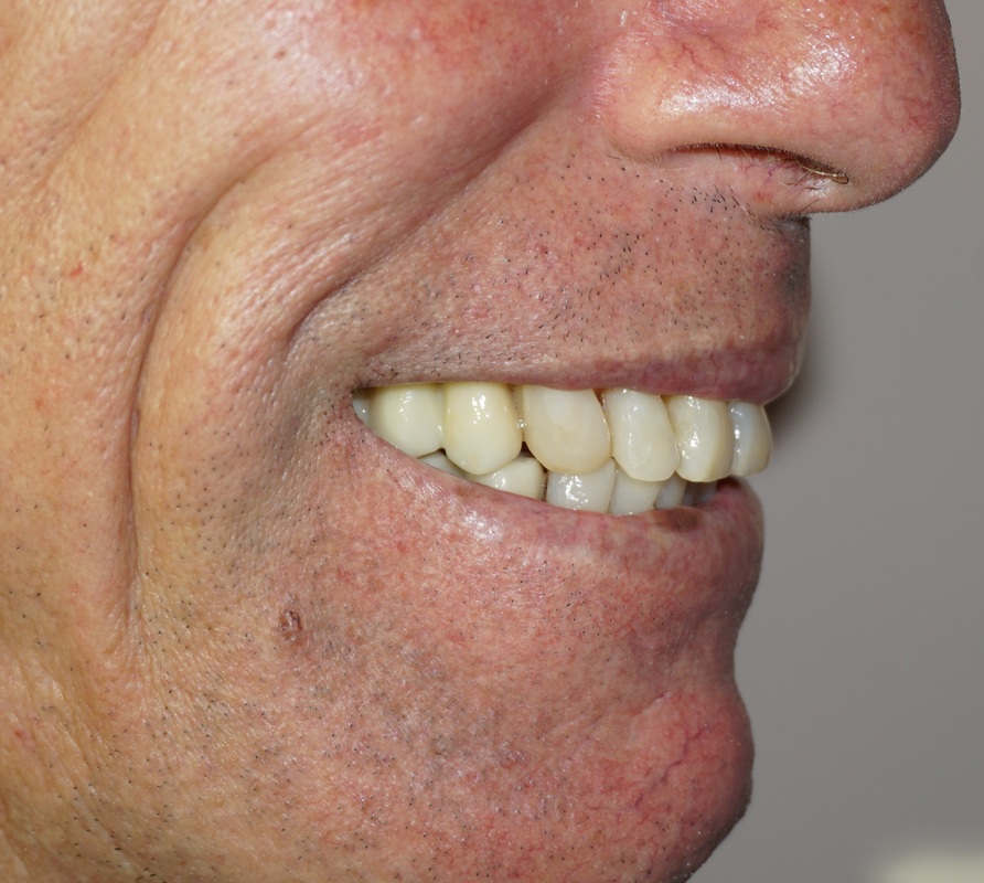 Missing teeth were replaced with dental implants. Teeth, damaged by bruxism (clenching and grinding), were restored with new myobite using all-ceramic veneers and crowns. During his 3-year follow-up visit the patient reported no headaches and no pain in the TMJs, improved sleep and dramatically decreased soreness of the neck muscles.
