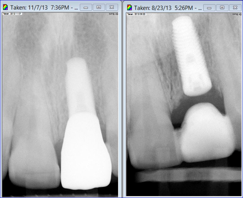 During only one 45-minute surgery both teeth were removed, a minor bone graft was placed and a wide-diameter (7 mm) dental implant was immediately inserted to replace the second molar. Four months later , #18 implant was restored with an all-ceramic crown.