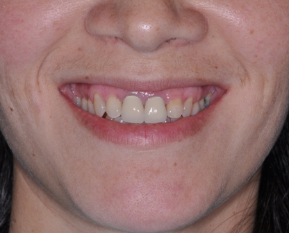 After thorough cosmetic evaluation, Dr. Andrews also suggested to do the laser gum re-contouring in order to reduce her “gummy smile”. The soft tissue diode laser was ideal  to be used in this case. Two old upper front crowns were replaced with All-Ceramic crowns.