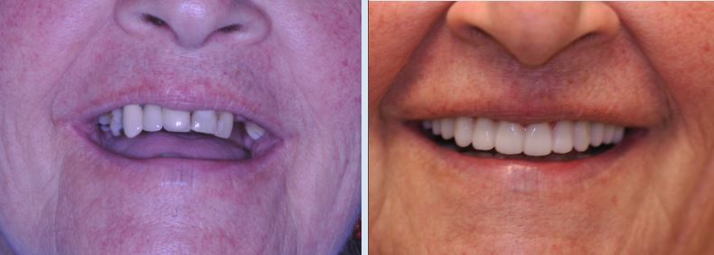 During a single surgery all remaining upper teeth were removed, bone grafts, sinus lifts were done and five dental implants were placed. A few months later this woman was smiling with a million-dollar smile she so long dreamed about.